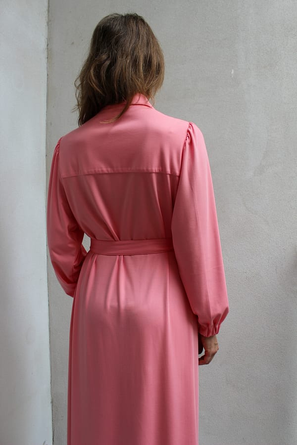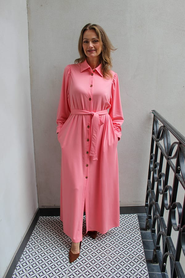 Šaty Karina S – dlhé košeľové šaty z talianskeho úpletu punto s opaskom a vreckami. Vhodné až do veľkosti 54+ a dostupné aj šitie na mieru. Navrhnuté a vyrobené na Slovensku. Univerzálny kúsok, ktorý môžete nosiť aj ako ľahký prehoz – ideálne do práce, na voľný čas aj na spoločenské príležitosti.