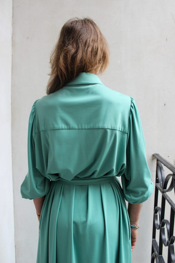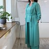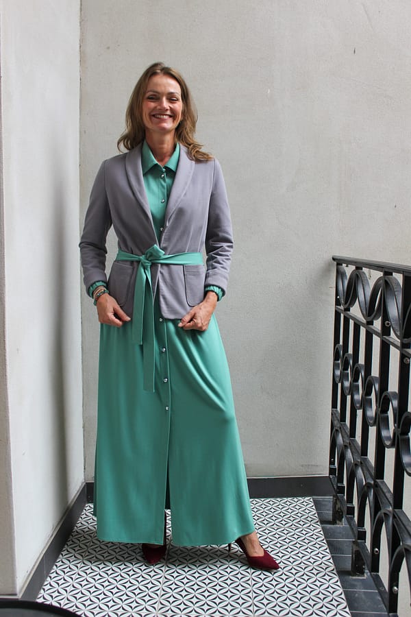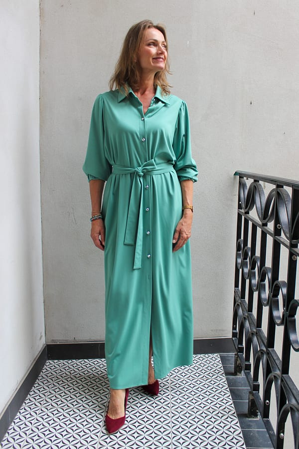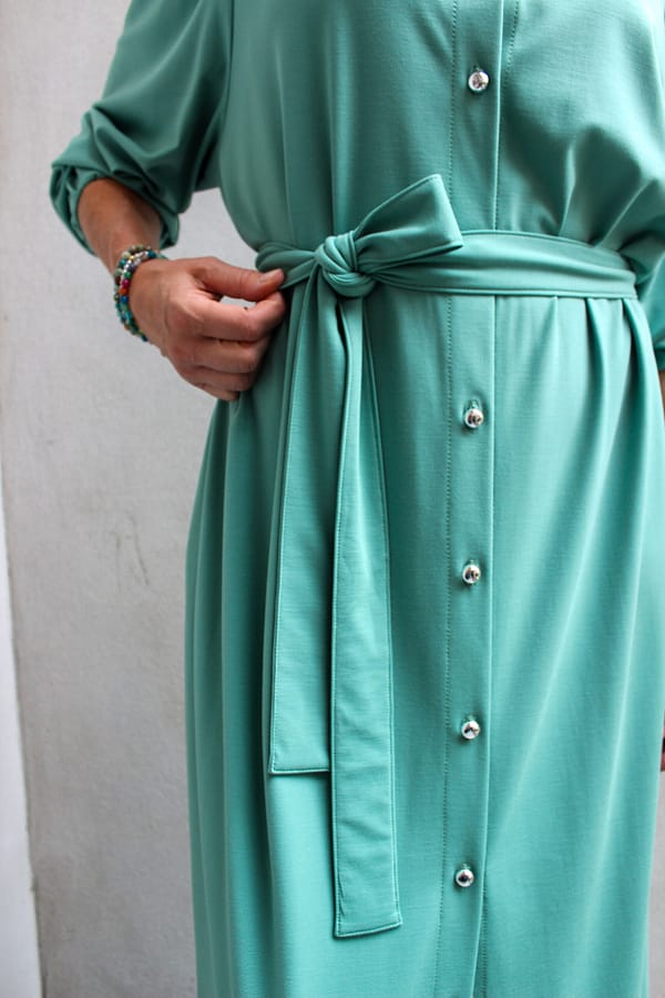 Šaty Karina S – dlhé košeľové šaty z talianskeho úpletu punto s opaskom a vreckami. Vhodné až do veľkosti 54+ a dostupné aj šitie na mieru. Navrhnuté a vyrobené na Slovensku. Univerzálny kúsok, ktorý môžete nosiť aj ako ľahký prehoz – ideálne do práce, na voľný čas aj na spoločenské príležitosti.