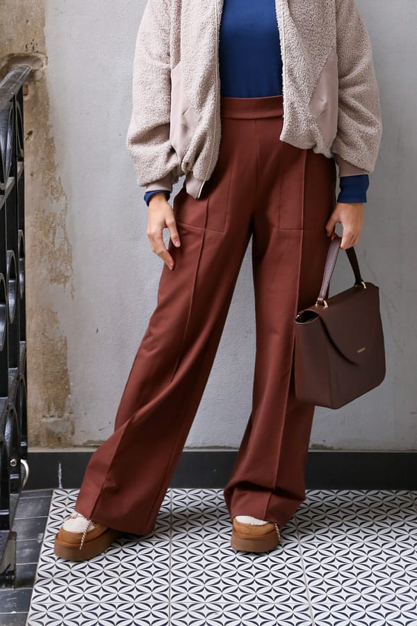 Vysoký pás zabezpečuje pohodlné nosenie a zároveň vizuálne predlžuje postavu. Široký strih spolu s jemnými zvislými švami v prednej časti vytvára elegantnú siluetu, ktorá lichotí rôznym typom postáv. Tieto prvky zároveň opticky zoštíhľujú nohy a dodávajú outfitu uhladený, ženský vzhľad.