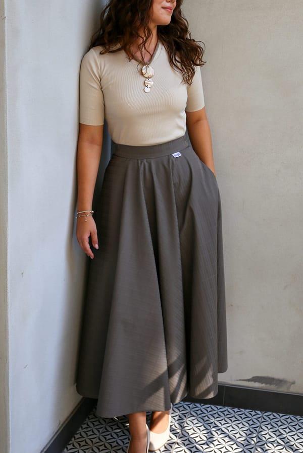 Kruhový strih sukne zabezpečuje nádherný objem a elegantné vlnenie pri pohybe. Predná dĺžka sukne je 85 cm, zatiaľ čo zadná dĺžka je 95 cm, čo vytvára moderný efekt high-low. Tento strih zvýrazní ženskú siluetu a pôsobí veľmi sofistikovane. Margaréta je univerzálnym kúskom, ktorý sa skvele kombinuje s jednoduchými topmi, košeľami či svetríkmi. Vďaka svojej nadčasovosti je ideálna do kapsulového šatníka – ľahko ju zladíte do elegantného aj ležérneho štýlu.