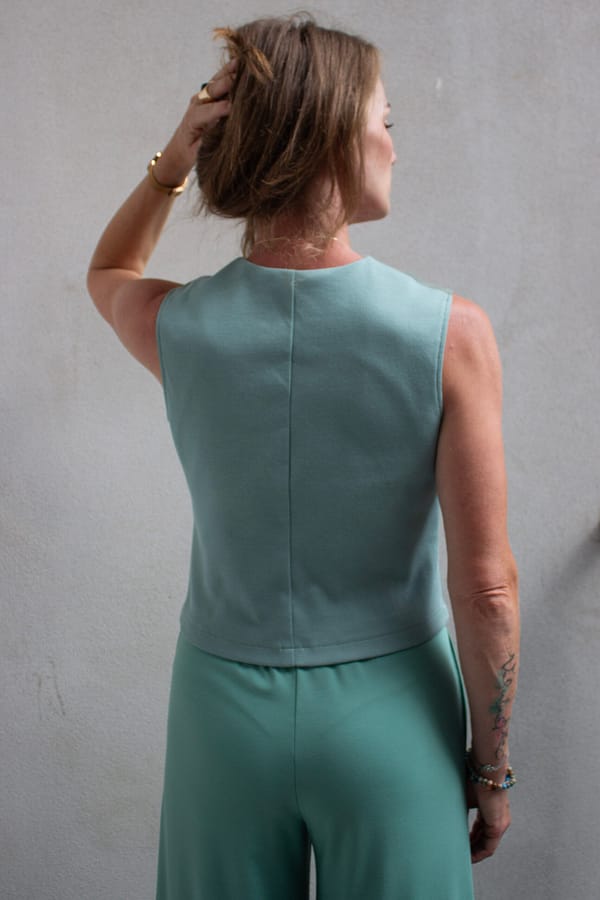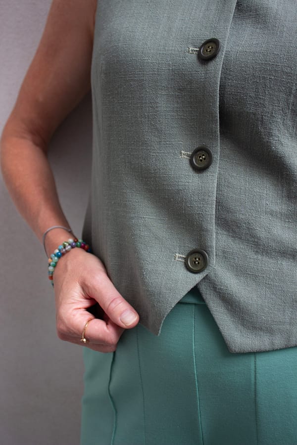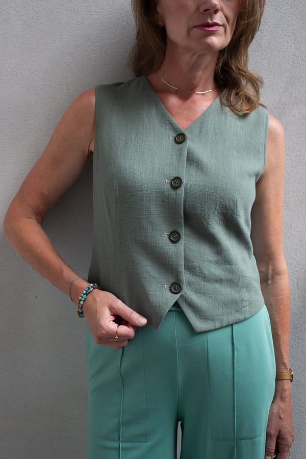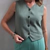 Zelená vesta z ľanu, viskózy a bavlneného úpletu s minimalistickým strihom je skvelou voľbou na vrstvenie aj samostatné nosenie – do práce, na voľný čas či každodenné outfity.